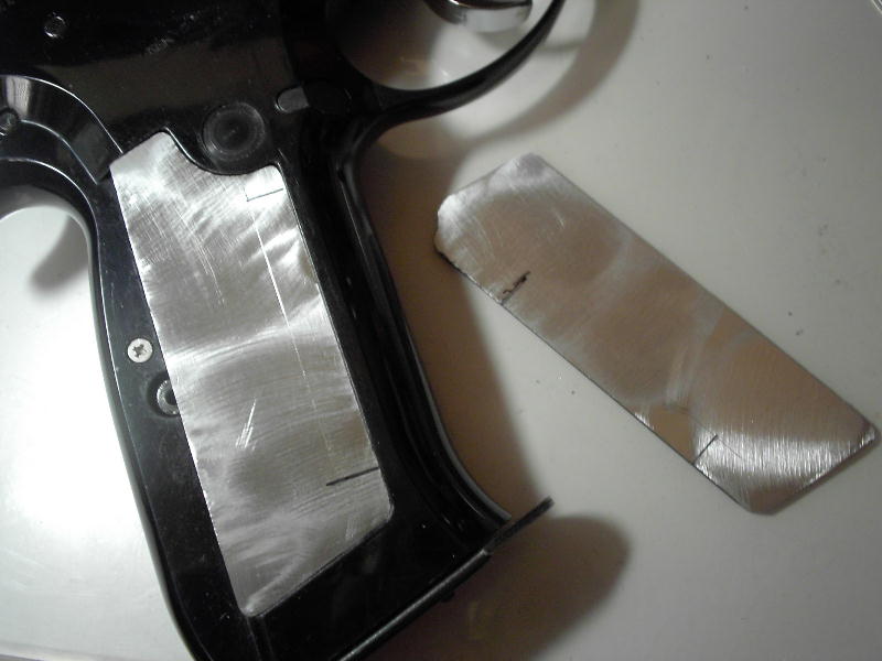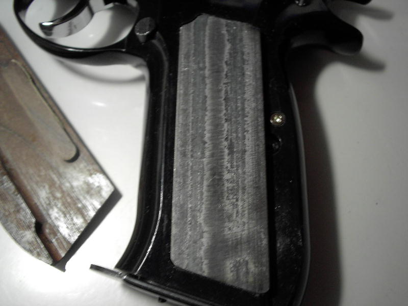 で・・・さっそく接着面をリューターで荒らしてからエポキシ接着剤をはみ出さない程度両面に塗ってグリップをフレームに仮留めして接着です